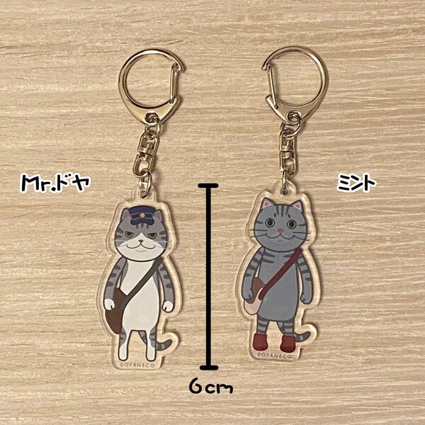 どやねこのリーダー、Mr.ドヤとミント・塩猫・はちわれのかわいらしいキャラクターイラストが目印のキーホルダーです。飽きのこないシンプルなデザインで、バッグやキーケースに付けるだけで癒されます。小さなサイズなので、持ち運びにも便利です。